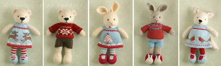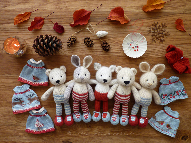 You are my favourite knitter ever! These five are adorable and their clothes colours are perfect for Christmas and winter time. You are so generous to accept to say good bye them… I hope you will hold your promise to blog more (and more and more!)Happy December, ♥ Anne