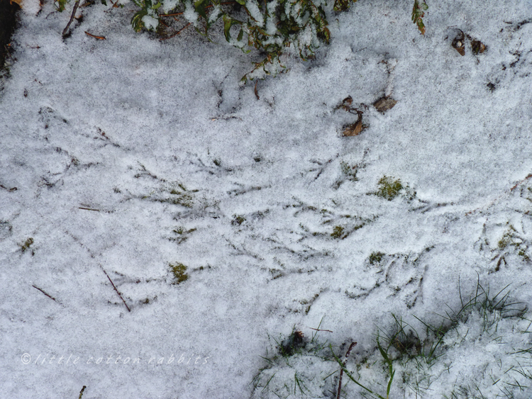 It has been really beautiful outside though. Unusually the snow has come in very localised showers and at times we’ve had bright sun light shining through the flurrying snow as it whispers it’s way to the ground. Thanks to the sub-zero temperatures it’s been that dry fluffy kind of snow rather than the slushy wet stuff that is more usual here and that’s created the perfect canvas for stories to be written across – stories written by the fox that trotted up the driveway in the night on silent and slender paws, circling around the car and searching for some supper, and stories from the birds who are up at dawn to begin the busy task of breakfasting, leaving a delicate trace of their dartings here and there. Finding these tracks in the morning when I go out to let the chickens out of the coop is one of my favourite things about freshly fallen snow.
