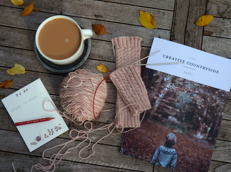 There are so many things that I should be doing at this moment, most of them involving tidying up the house after the long summer months of not really bothering, but I am not quite sure where to start. The long list of tasks in my head, all vying for equal importance status, are tangled like the yarn in my workbasket and refuse to form an orderly queue and be committed to paper. So instead I’m procrastinating and knitting simple cabled pink wrist-warmers with beautifully soft Shalimar breathless in ‘velvet slippers’ and flipping through the new issue of Creative Countryside.