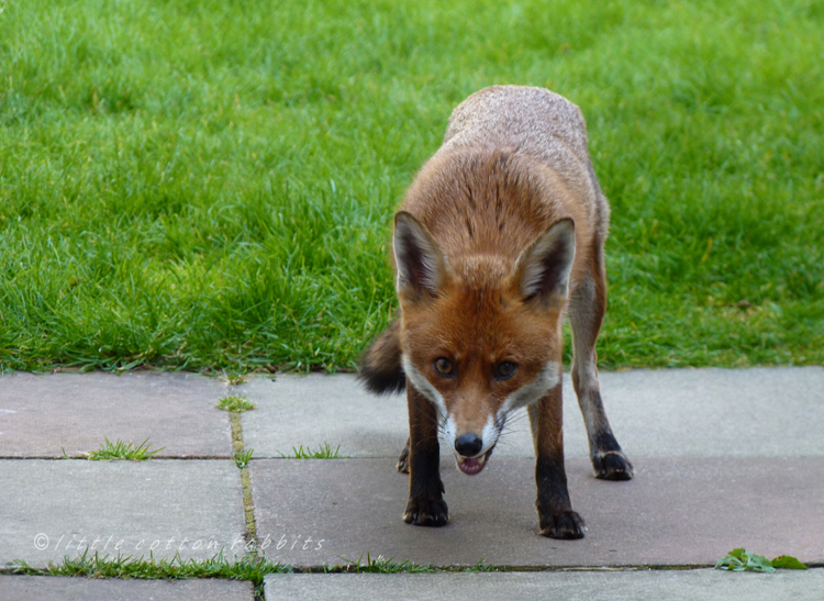 Earlier in the year I posted a picture of the fox peeking through our garden fence and she’s been a fairly regular garden visitor ever since. When I first got a good look at her she seemed quite sleek and almost plump but more recently has seemed thinner, and thinking perhaps that food might be a bit scarce I’ve been offering her a meal whenever she turns up – she seems particularly fond of leerdammer cheese 🙂