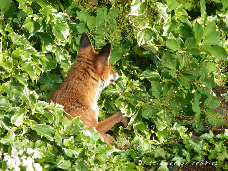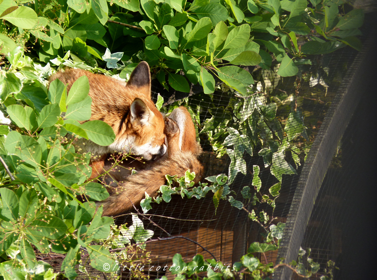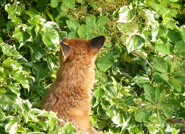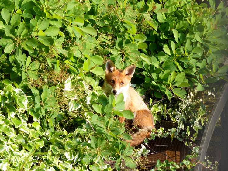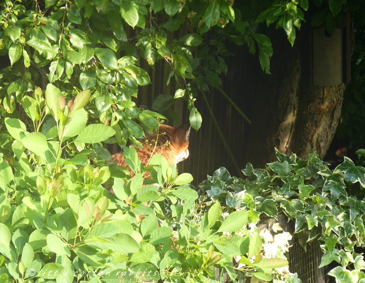 Some mornings I wake early and can’t get back to sleep. Sometimes I read, sometimes I knit and sometimes I open the blind and watch the sunrise sky. A couple of weeks back I was leaning out of the bedroom window just after the sun had risen and was sleepily daydreaming as I looked around our garden below. A flash of orange caught my eye, peeking out between the tangle of ivy overgrowing the chicken run and I probably frowned in puzzlement, but it soon became clear that the plastic mesh netting that keeps the chickens safely contained in their run makes a rather comfy hammock for a sleepy fox.