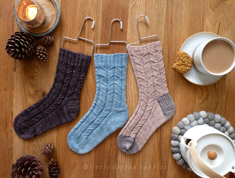 The 3 pairs above are all made from Skein Queen Crush DK in ‘limpet’, ‘dreamcloud’, and ‘highclere castle’ with the pair on the left knitted from Emily Foden’s Snowshoe pattern and the other two from Cabinfour’s Laule’a pattern