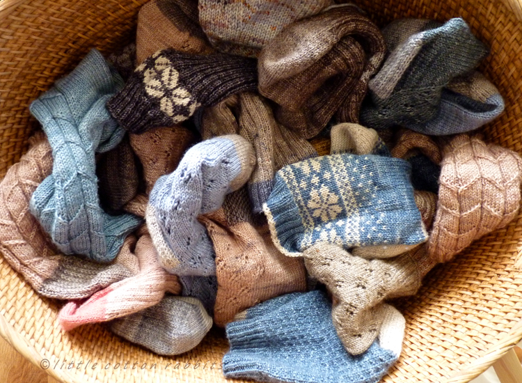 Knitting is such a soothing process and even just looking at your beautifully knit socks is wonderfully calming. My mind and my hands just imagined the feel of the yarn, the softness and such visual pleasure. I also stick with the same thing, socks, mittens,cowls and of course little rabbits and their clothes. Thank you for sharing.