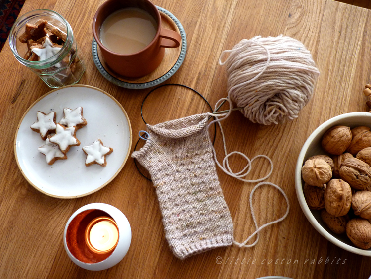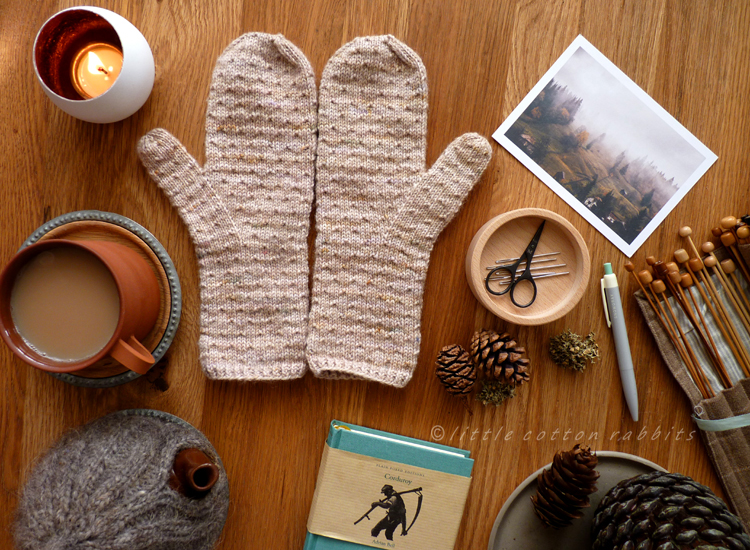 Along with bunny knitting I’ve been knitting lots of mittens. I have lots of wristwarmers, which I wear constantly throughout the winter months, but have been getting cold fingertips on my woodwalks and so it seemed a good plan to knit something a bit more cosy. This was a free pattern that I found on Ravelry and it’s perfect, knitting up very quickly and with such a clever and comfortable thumb placket. It’s called Garnomeras enkla vantar by Maria Samuelsson and I’ve loved knitting these in the ‘silver birch’ organic merino Viola yarn that I gifted myself for Christmas, a beautiful hand-dyed yarn which has so many subtle tones. In fact I love the pattern so much that I’ve knitted a second pair, also in Viola Organic merino yarn, colourway ‘frozen earth’. I have made a few modifications to the pattern (which is written for worsted weight yarn) in order to accomodate the DK yarn weight and I’ve added a little texture too – notes are over on my project page.