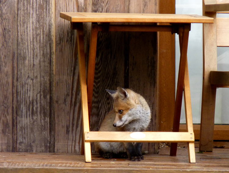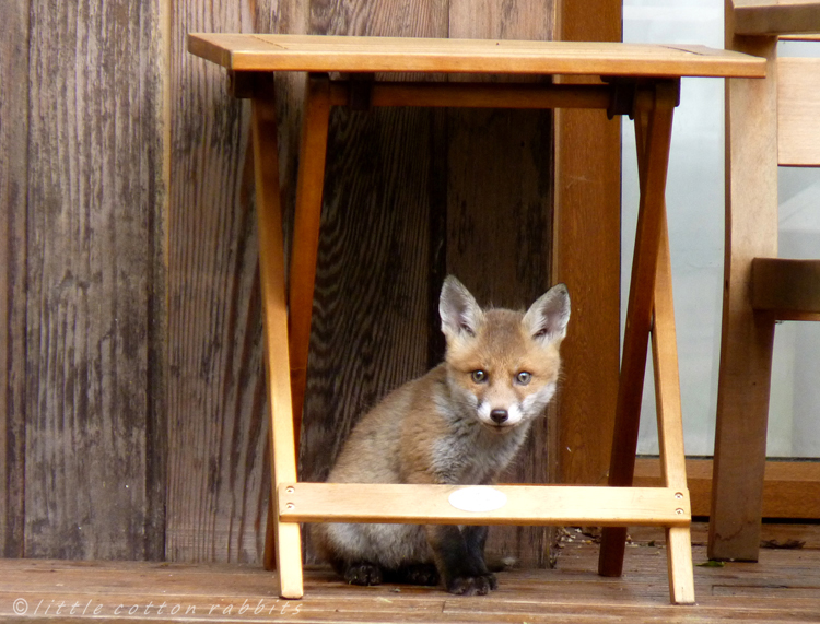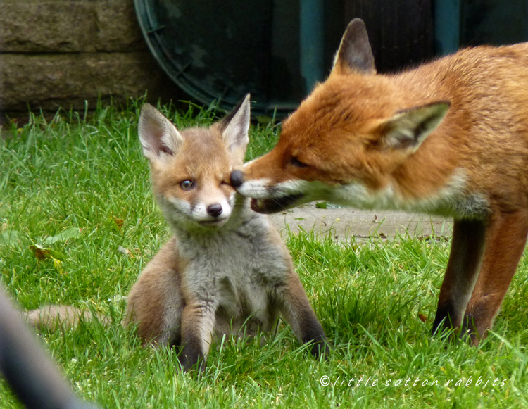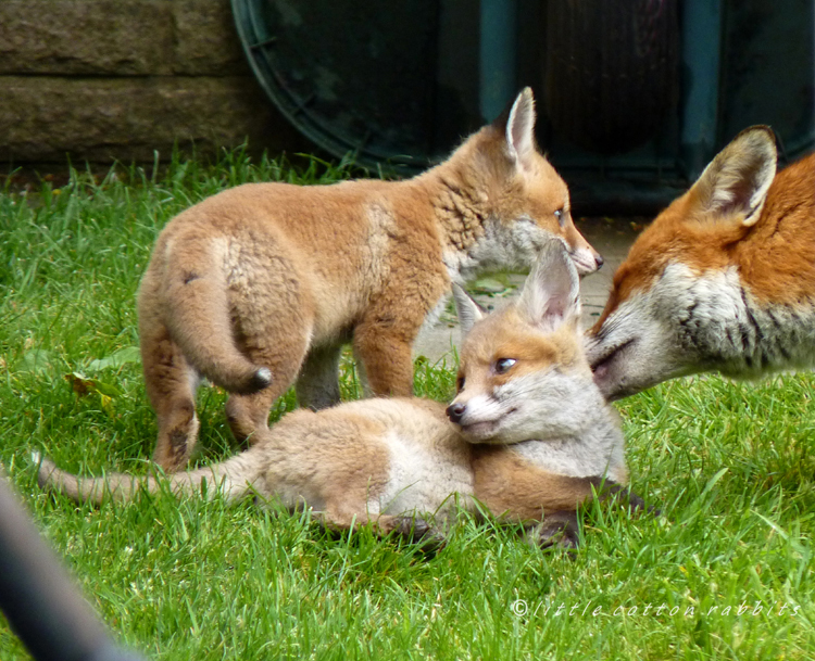 On Sunday morning I woke up at just before 7am and got up to feed the chickens and just as I was coming back into the house I heard a sound behind me and there was Kit again. I was so pleased to see her and found her a snack, which she promptly carried off to a corner of the garden. There was a movement in the bushes and as she came back to enquire about further snacks a small, plump and fluffy bundle came running after her. I sat on my kitchen floor for the next 40 minutes with my camera, feeling immensely privileged to be witnessing the scene before me as Kit washed and cleaned her three little ones: nibbling at their fur to groom out fleas; snuffling their plump bellies and licking their ears. Like all small children they squirmed and complained and played up, running off to investigate various bits of the garden and giving some of my garden furniture a nibble in the process and she was wonderfully tender and loving with them. Eventually she came right up to the back door again to see if I had one last snack and two of the cubs followed her. By the time they all trotted of into the bushes again I’d taken 240 photos on my camera. So these are the highlights 🙂