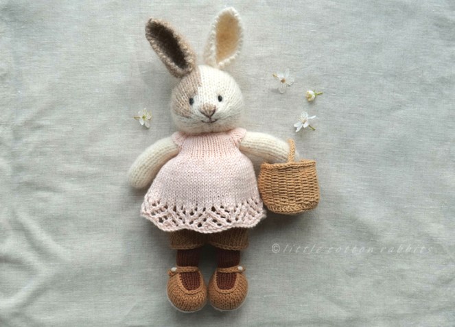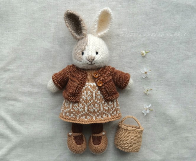 The bunny is knitted in Camarose Snefnug yarn (one of my current fluffy favourites) with clothes in Krea Deluxe organic cotton. The lace dress is from my ‘textured dresses pattern‘, the colour-work dress is the one that comes with the lamb pattern, and the basket is from my toy bags pattern.