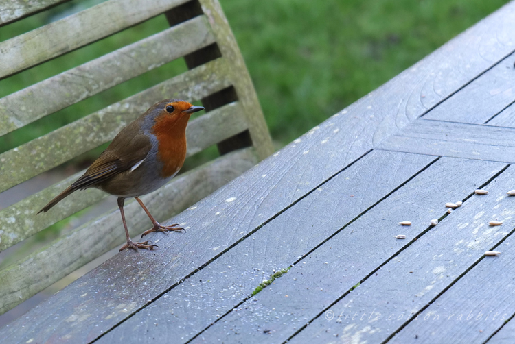 - I have a new garden friend, Bob D. Robin, who flies down to the garden table each morning at dawn when I’m preparing breakfast for the chickens, he gets a pinch of sunflower seeds as a thank you for brightening the start of my day with his beautiful song, sung from the topmost branch of the old plum tree.