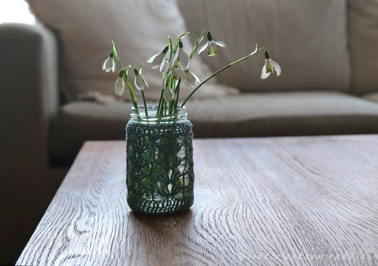 Although winter still has the countryside in it’s grip, there are signs that a change is coming, and the first flower of the year is now in bloom, the glorious snowdrop. I never feel right picking wildflowers to bring home, they all have an integral part in the wild eco-system, so I take only photos when I’m out and about, but the snowdrops in the little glass jar (clothed in beautifully made crochet by my friend Esther) were garden-grown and gifted to me by my cousin-in-law Nicky and are a beautiful reminder of their wild kin that are carpeting the woods right now.