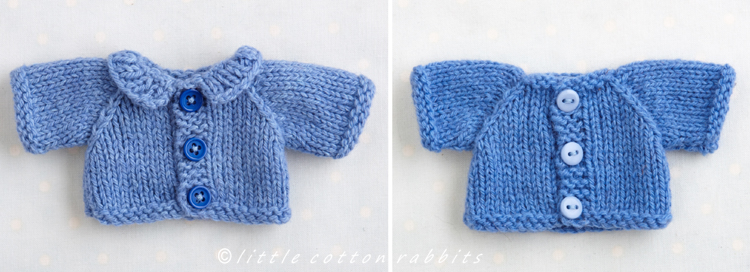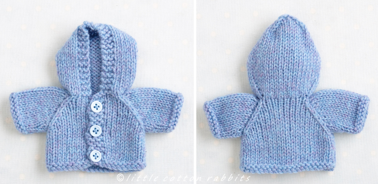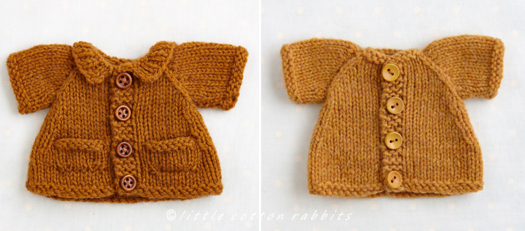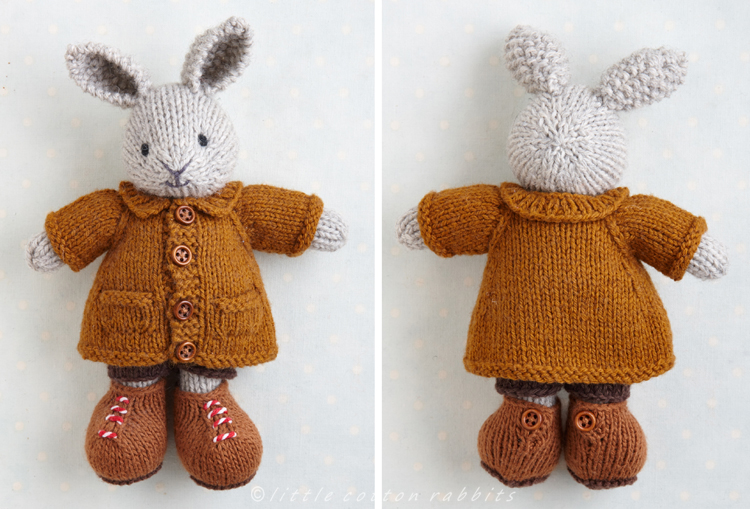 The short cardigan/jacket and the longer ‘A’ line coat can both be made with either a round neckline, a little ribbed collar or a hood. The hood will fit over the head of the animals with smaller ears such as the mouse and bear and for the animals with taller ears, such as the rabbit, it looks nice just folded at the back and I’ve designed it with a curved bottom edge when it’s worn in this way.