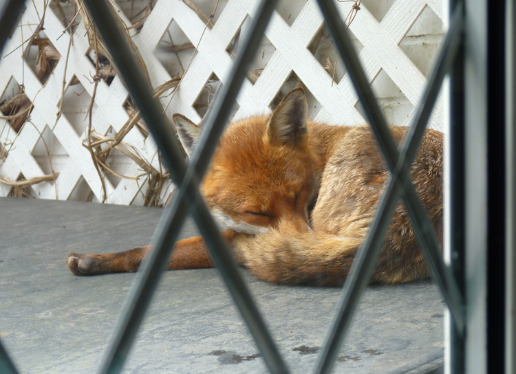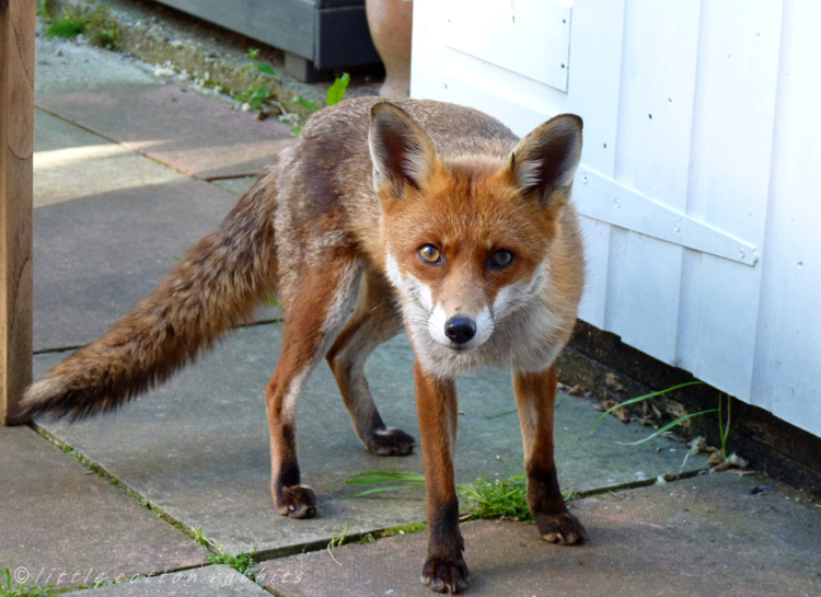 We share our garden with lots of visitors and I take a lot of pleasure from their visits. In the past we’ve had orphaned hedgehogs, blackbirds, friendly robins and more recently a couple of squirrels, a family of blue-tits and our resident fox, Kit. She’s really made our garden her personal space and though she doesn’t visit every day, she’s often to be found waiting for me first thing in the morning, either sitting outside the back door, napping on top of the woodshed or stretched out sunbathing on the garden table. I feel very privileged to have been adopted by her.