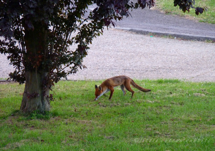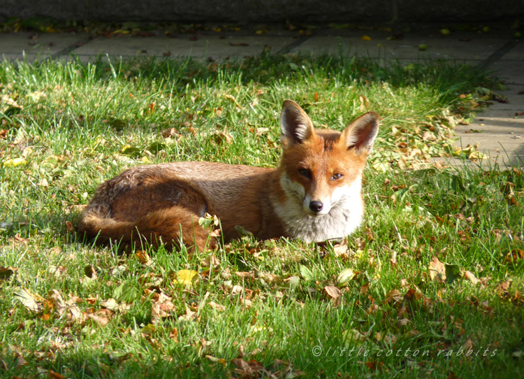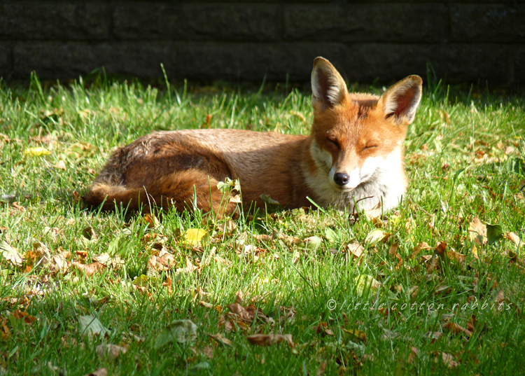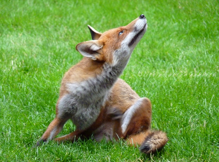 Kit, our foxy visitor, has been coming almost every day. Back in January she seemed to be getting into lots of fights and was quite injured one morning – you can see in the pictures above her patches of missing fur and scrapes but she also had a bad limp and a broken canine tooth. She spent a day licking her wounds and curled upon top of the chicken run – the ivy-covered netting forms a comfy hammock and happily the chickens seemed oblivious and carried on life as normal! More recently I noticed that she was pregnant – she was distinctly plump around the middle and I think that she had her pups on the 2nd or 3rd of March as she didn’t visit on those days and when she arrived on March 4th she was back to her skinny self. Since March 12th she’s back to visiting every day for food and her teats are now clearly visible, so her cubs must be thriving. And yes, I am keeping a fox diary ๐