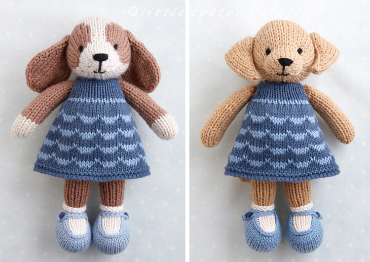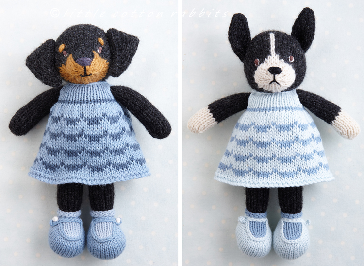 - a dog in a dress which has knitted on panties, socks and shoes and the choice of 2 dresses, one knitted with a cabled chain texture in a single colour and another knitted in two colours with a simple, stranded swag design.
