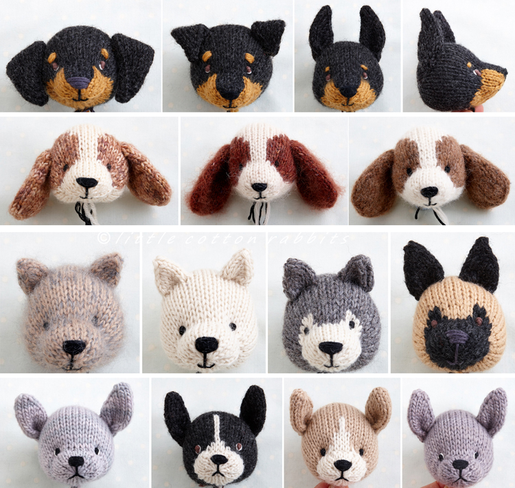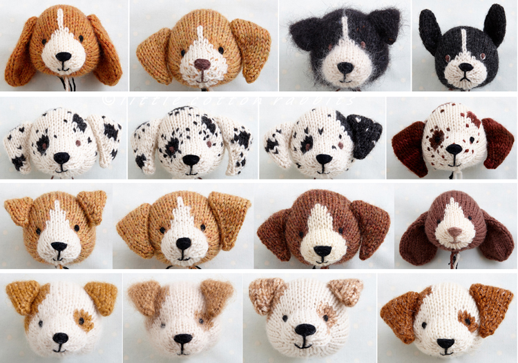 The patterns contain a single basic head shape with 8 different colour-work treatments and this combined with 7 different styles of ear gives you a lot of options to make different breeds of dogs.