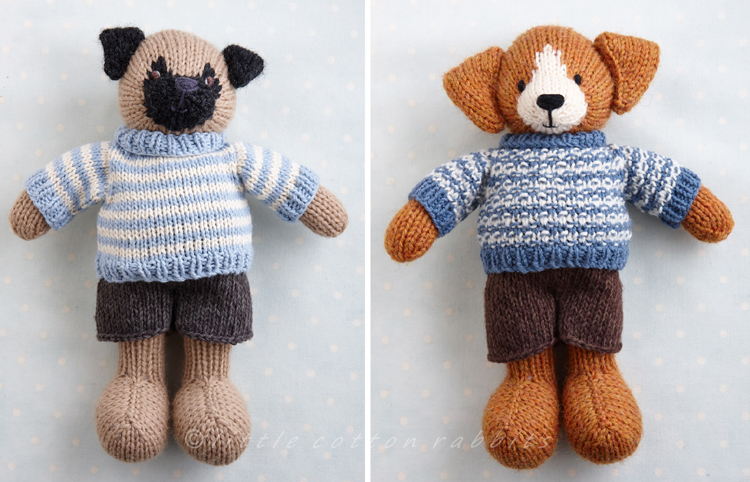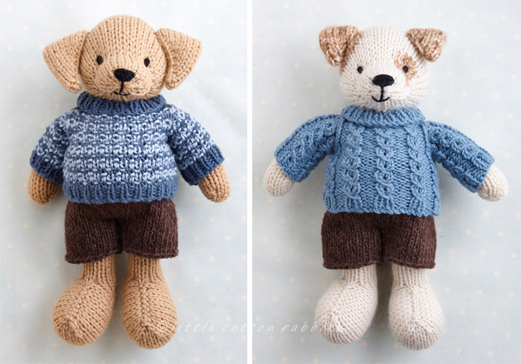 - a dog in a sweater and shorts, which has a bare body and legs and comes with removable shorts and a choice of 2 sweaters, one knitted with a mock cable texture and the other in a simple 2 colour texture which is a lot easier to knit than it looks.