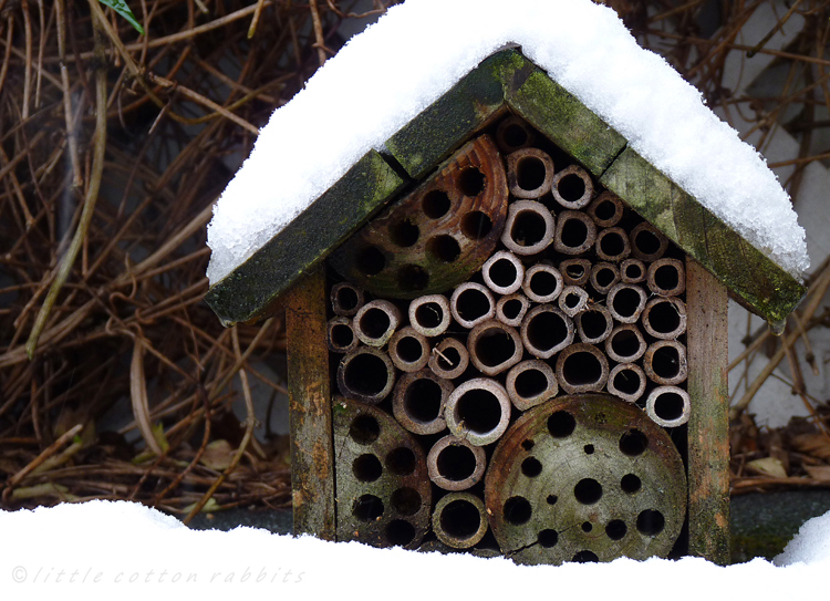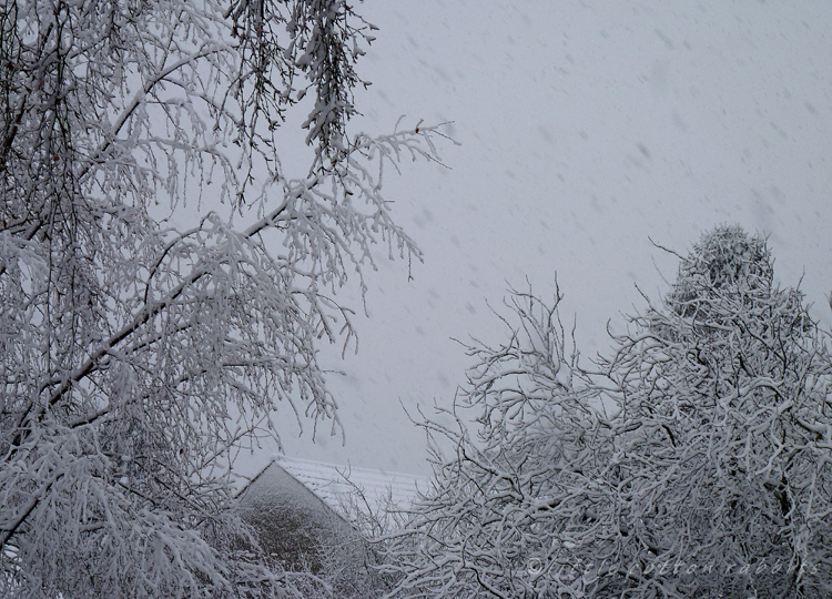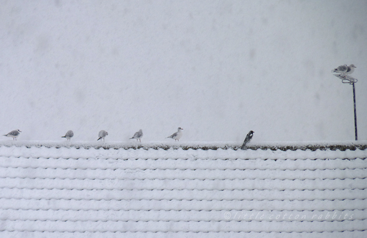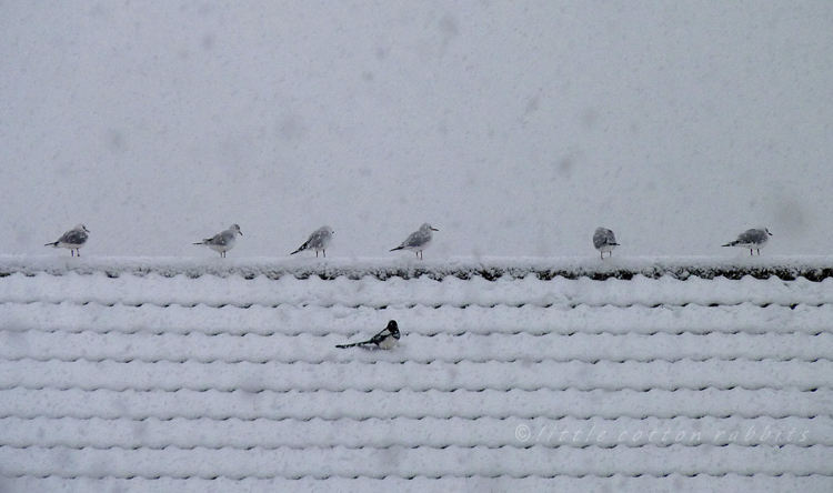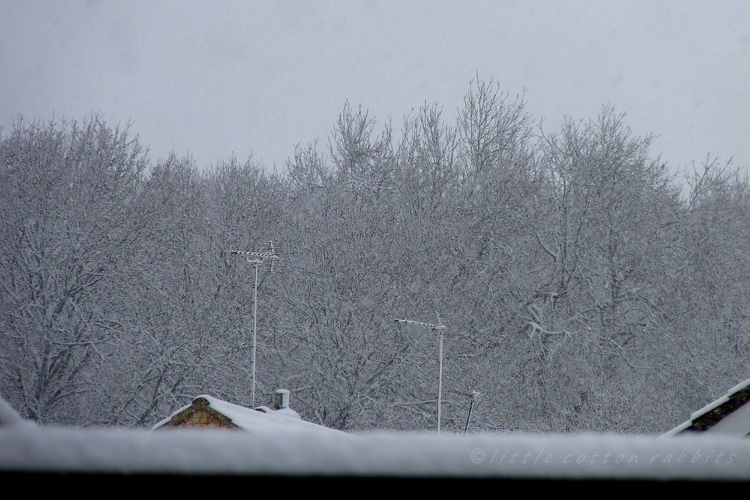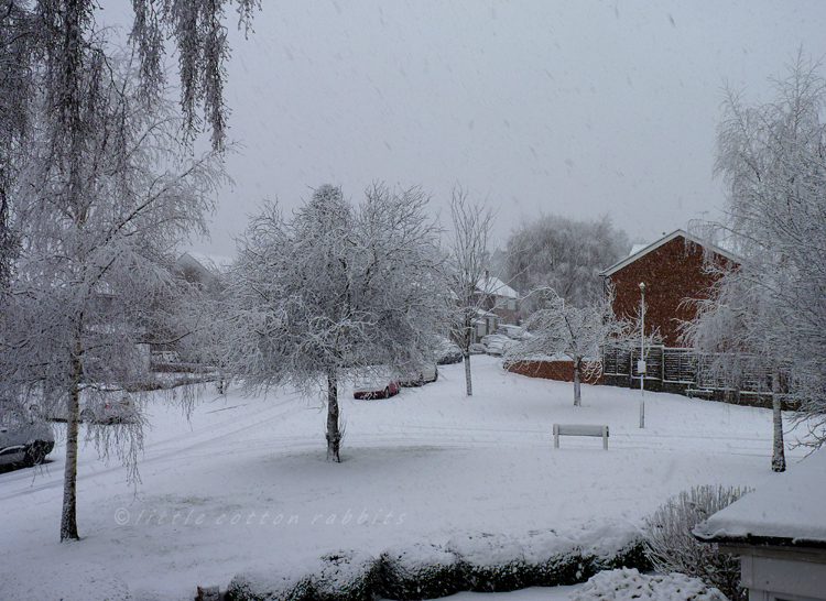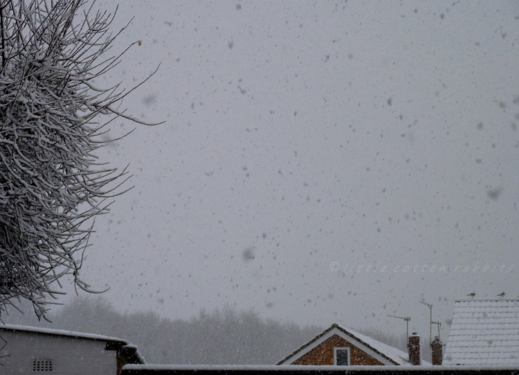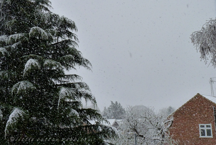Well, the weather forecast for yesterday was accurate and we did indeed get snow. Quite a lot of it as it happens, well at least compared to what we might usually expect here and even the birds were too perturbed to fly.ย ย It was a nice quiet and lazy day. Whilst we were far from being snowed in we decided not to venture out in the car and instead orbited the cosy zone in front of the fire, occasionally braving the outside chill to bring in more wood and fill the coal bucket. Toby was so excited to see the snow and wanted to go outside but didn’t want to put shoes on (in his mind shoes are for going out of the front door only) and so he was outside for only a couple of seconds in his socks before, shrieking with excitement, he came leaping back inside leaving wet footprints all over the kitchen. It was worth having to clean up just to see his delight at the white stuff and I made sure he had cosy, dry socks to warm up in.