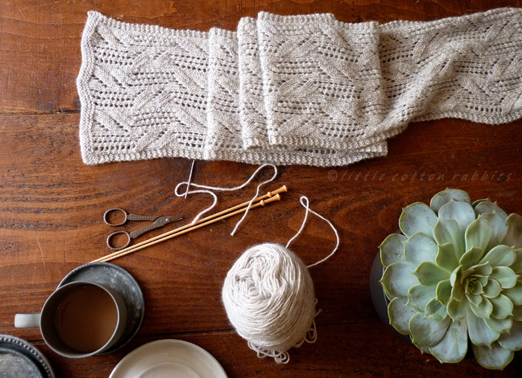 I’ve finished and am wearing the scarfย above, knitted in the beautiful Blend No. 1 from Ysolda. I do love the softness of this yarn and it is wonderfully warm and soft next to the skin. The pattern is the Flora Cowl by Carrie Bostick Hoge but I’ve made it into a long scarf instead of joining the ends to make a cowl.